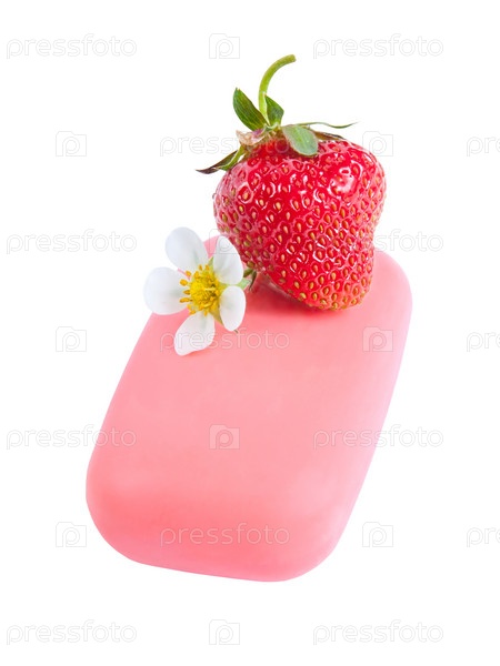 Натуральное мыло с клубникой и цветком, изолированное на белом фоне