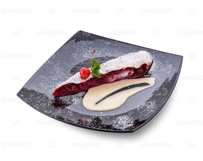 Кусок вишневого пирога на черном блюде
