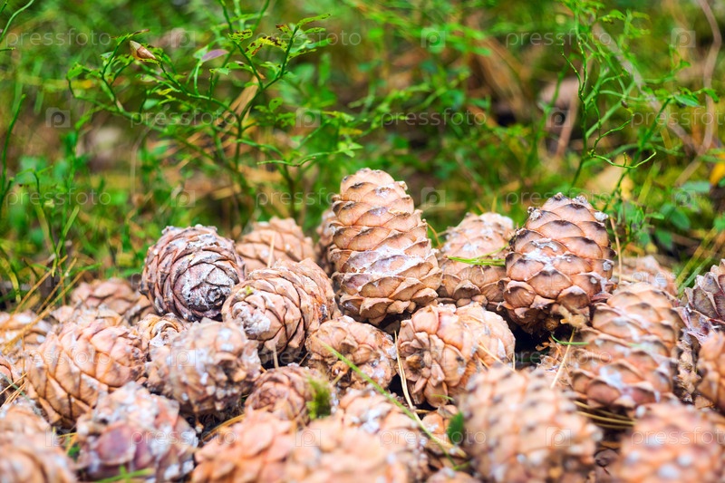 Шишки лежат в куче в лесу