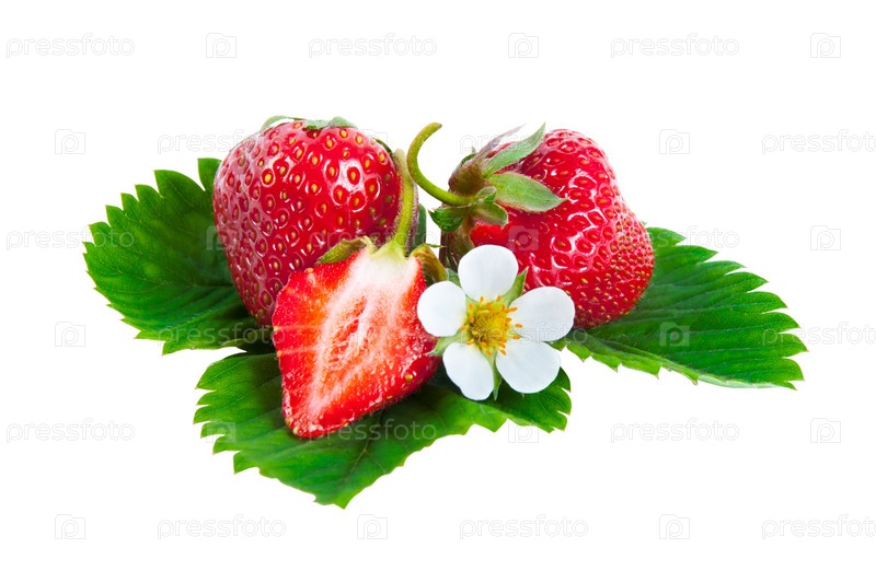 Клубника на зеленых листьях, изолированная на белом фоне