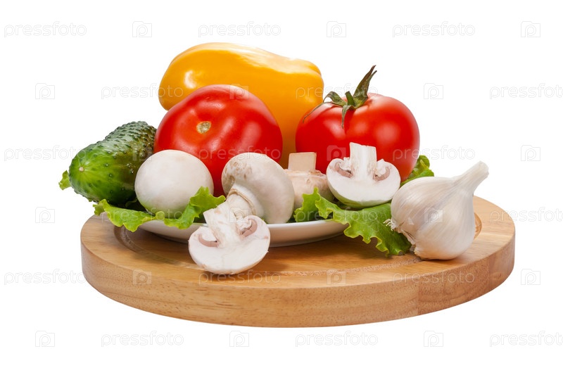Овощи и грибы на тарелке на разделочной доске, изолированные на белом фоне