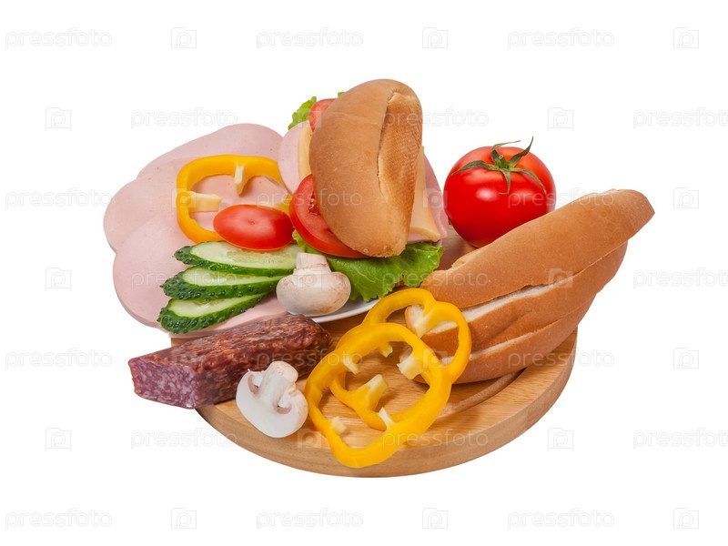 Овощи, грибы, колбаса и хлеб для сэндвичей на разделочной доске, изолированные на белом фоне