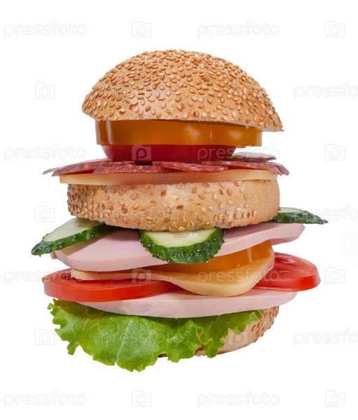 Большой бутерброд с колбасой и овощами, изолированный на белом фоне