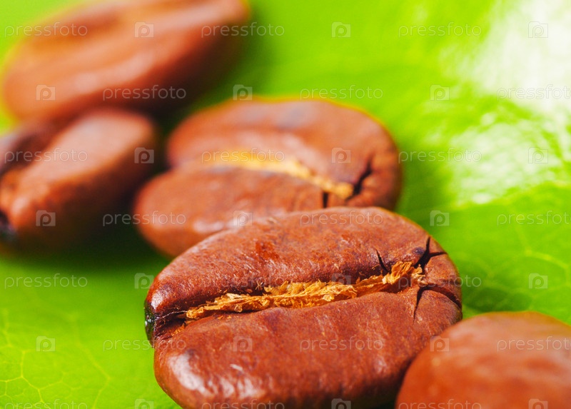 Несколько зерен кофе на зеленых листьях