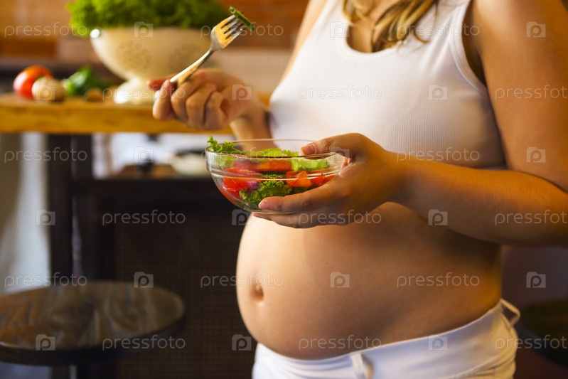 Молодая беременная женщина ест салат из свежих овощей на кухне