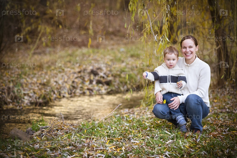 Молодая мать с сыном в осеннем парке