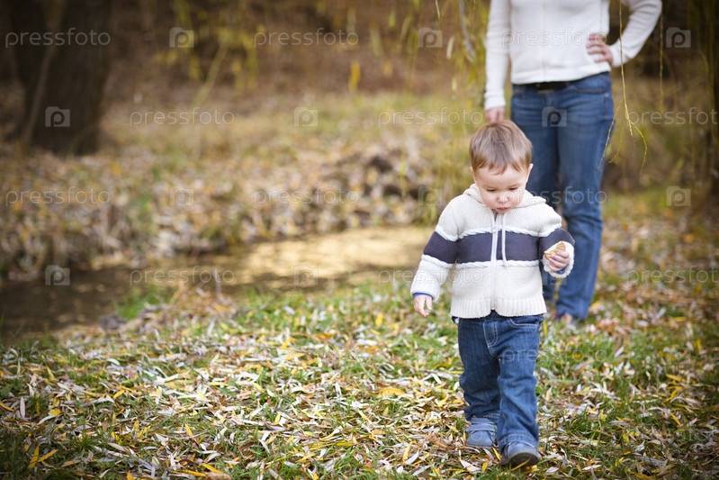 Молодая мать с сыном в осеннем парке