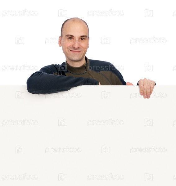 Счастливый мужчина с плакатом, изолированный на белом фоне