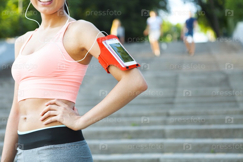 Молодая красивая женщина с музыкой на тренировке