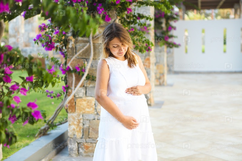 Беременная женщина, касаясь своего живота руками