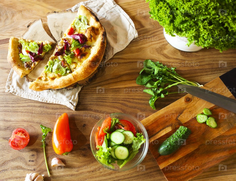 Домашняя пицца и овощи на деревянном столе
