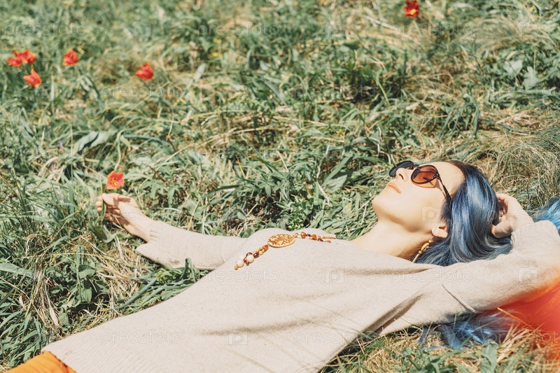 Красивая девушка отдыхает на лугу