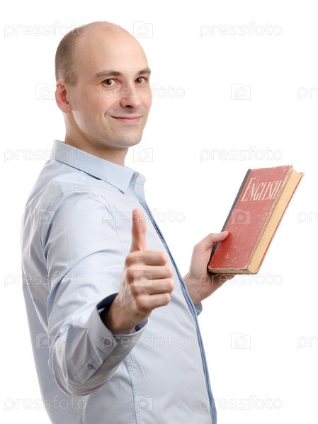 Мужчина с учебником по английскому, изолированный на белом фоне