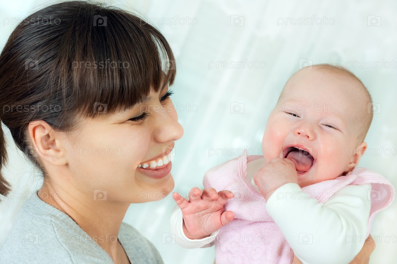 Молодая счастливая мама с младенцем