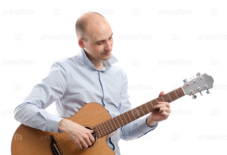 Счастливый мужчина с гитарой, изолированный на белом фоне