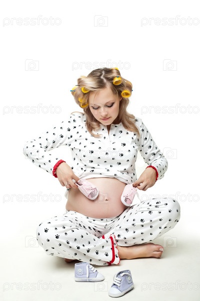 Беременная женщина с маленькой обувью в руках