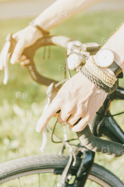 Мужские руки держат руль велосипеда