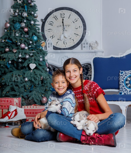 Дети со щенками хаски