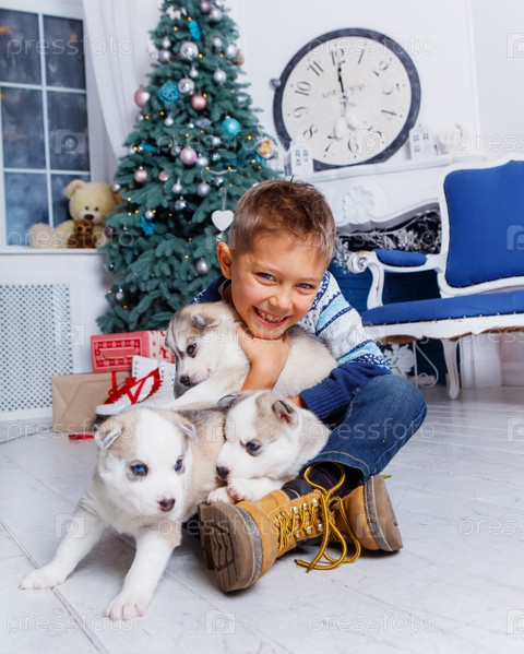 Маленький красивый мальчик и щенок хаски