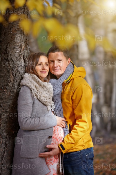 Беременная женщина с мужем осенью
