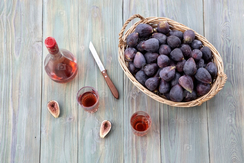 Спелый инжир в плетеной корзине и бокалы с вином