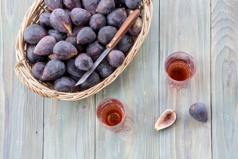 Спелый инжир в плетеной корзине и бокалы с вином