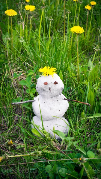 Маленький снеговик в зеленой траве