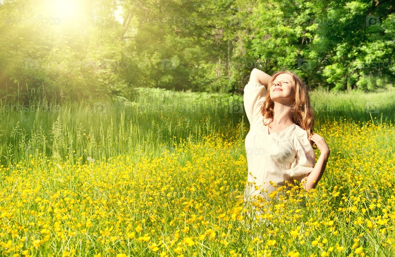Красивая девушка с одуванчиком наслаждается солнцем в летнем парке