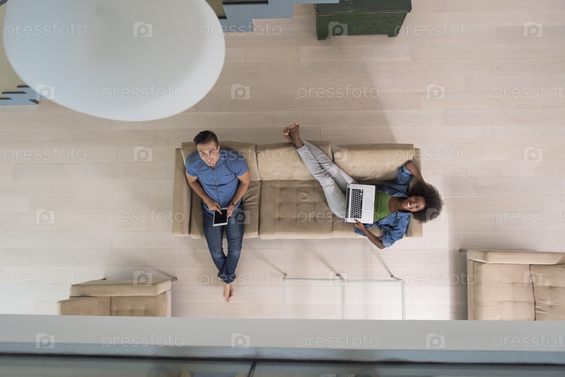 Молодая многонациональная пара отдыхает в гостиной