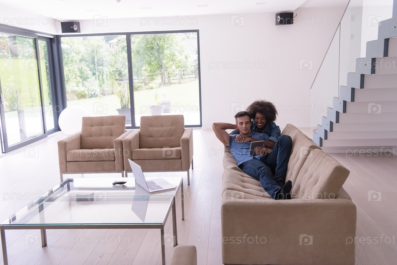 Солодая многонациональная пара отдыхает в гостиной