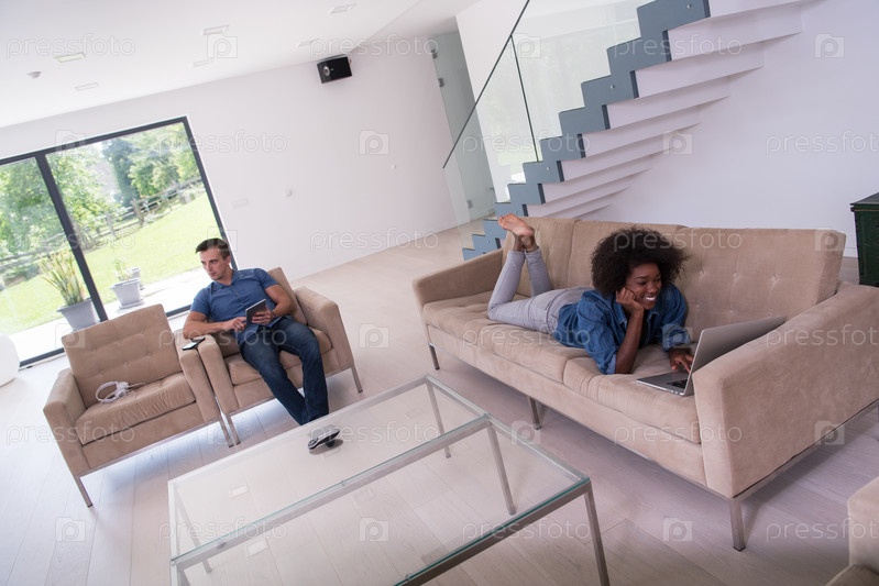 Молодая многонациональная пара отдыхает в гостиной