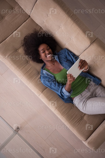 Афро-американская женщина в доме с цифровыми планшетом