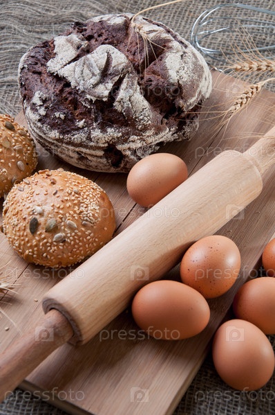 Хлебобулочные изделия, куриные яйца и кухонные принадлежности