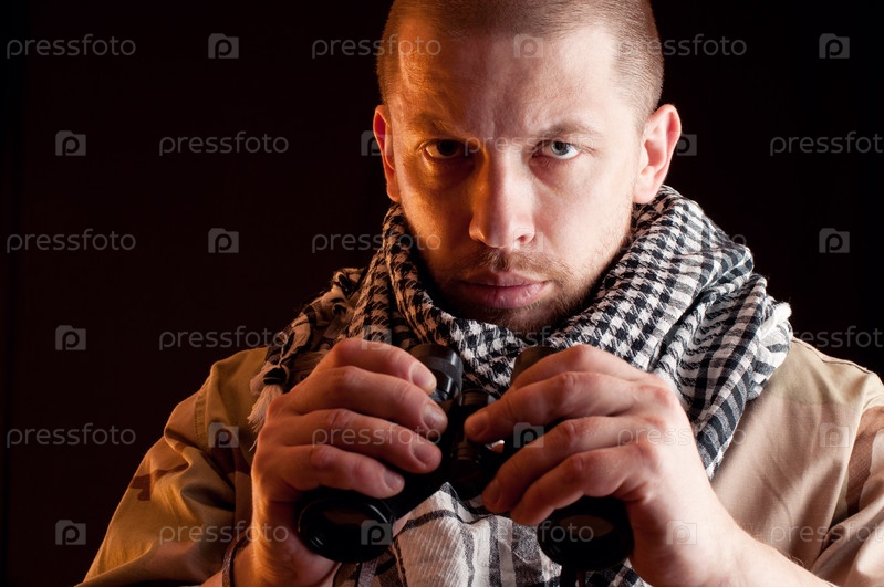 Наемник в камуфляже с биноклем в руках