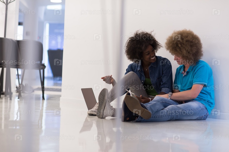 Многонациональная пара сидит на полу с ноутбуком и планшетом
