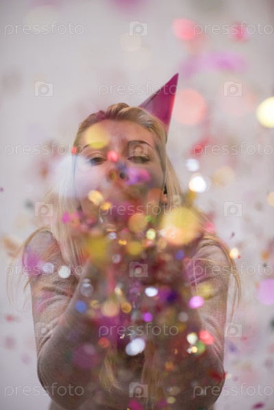 Женщина дует конфетти в воздух