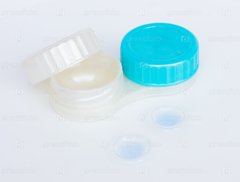 Контейнер с контактными линзами на белом мокром фоне
