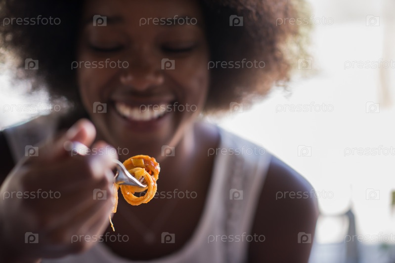Женщина ест макароны