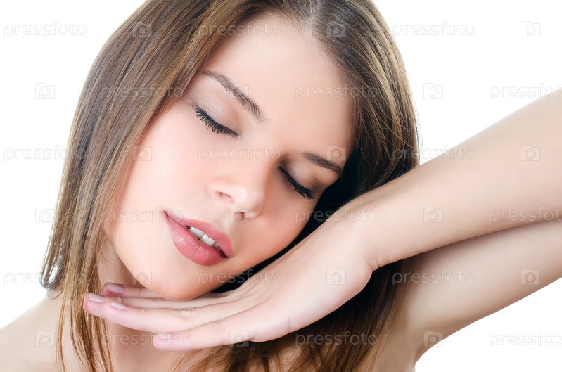 Портрет девушки с закрытыми глазами, изолированной на белом фоне