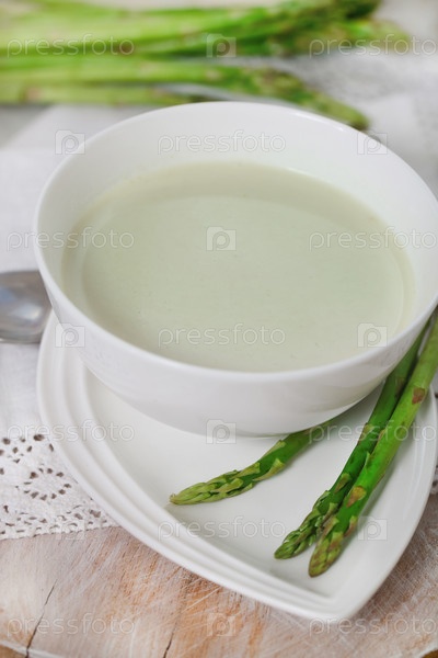 Суп со спаржей в миске и ростки спаржи
