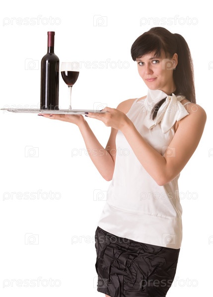 Официантка с бутылкой вина и бокалом на подносе, изолированная на белом фоне