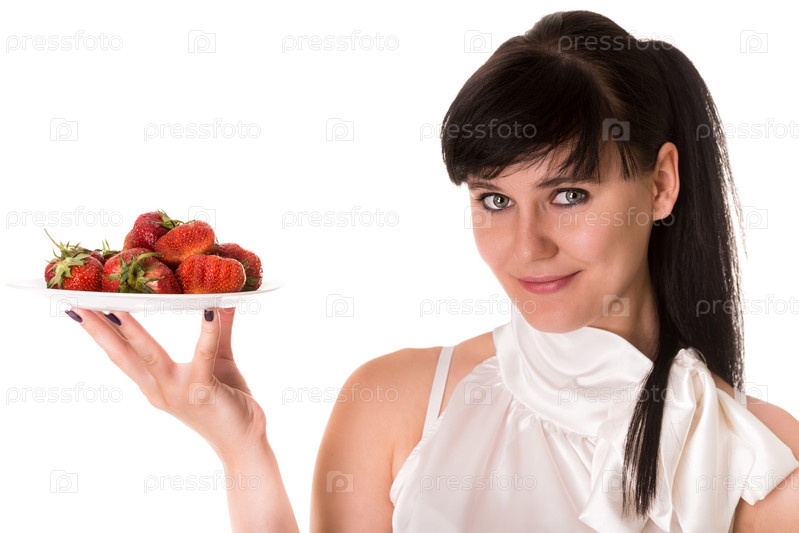 Официантка с клубникой, изолированная на белом фоне