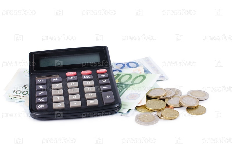 Разные монеты и банкноты евро и калькулятор