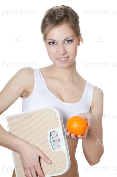 Красивая девушка с апельсином и весами