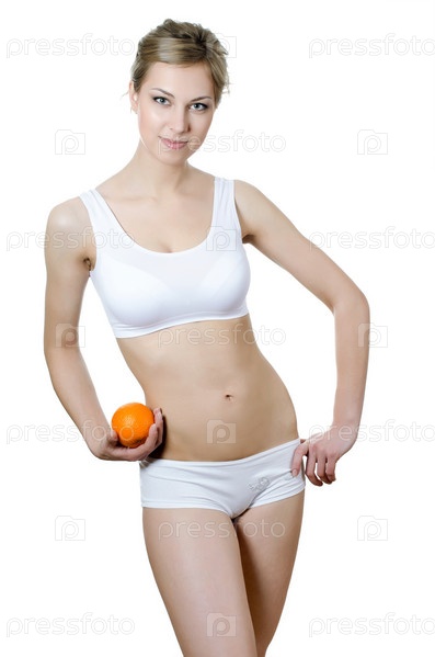 Красивая девушка с апельсином изолирована на белом