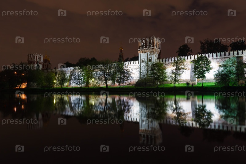 Новодевичий монастырь на берегу пруда в свете фонарей, Москва