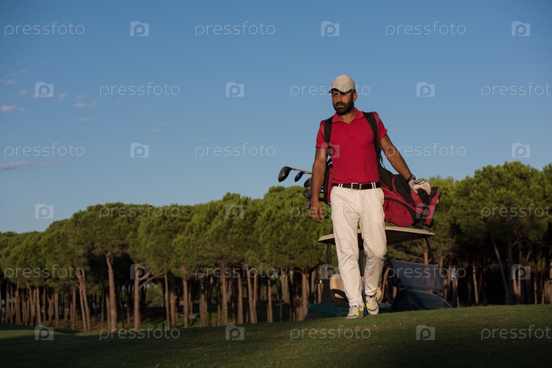 Игрок в гольф, ходьба и проведение упражнений для гольфа