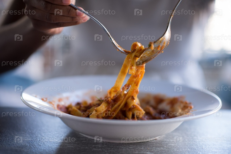 Женщина ест макароны