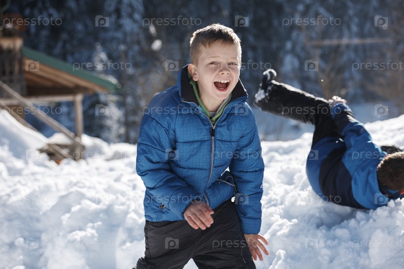Дети, играющие со свежим снегом