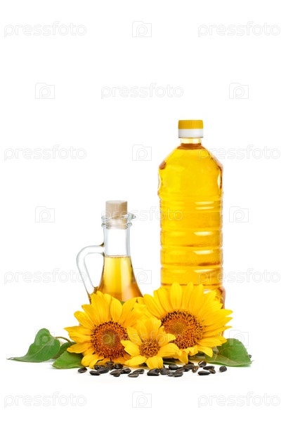 Красивый подсолнечник и подсолнечное масло на белом фоне